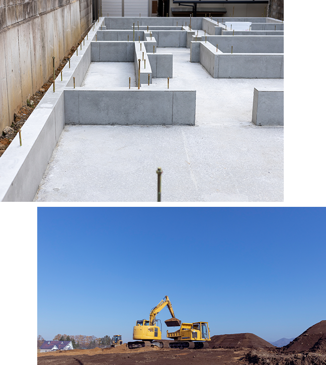 建物の土台となる基礎工事に対応。これから建築する建物の強度に関わる重要な工事ですので、責任を持って施工いたします。